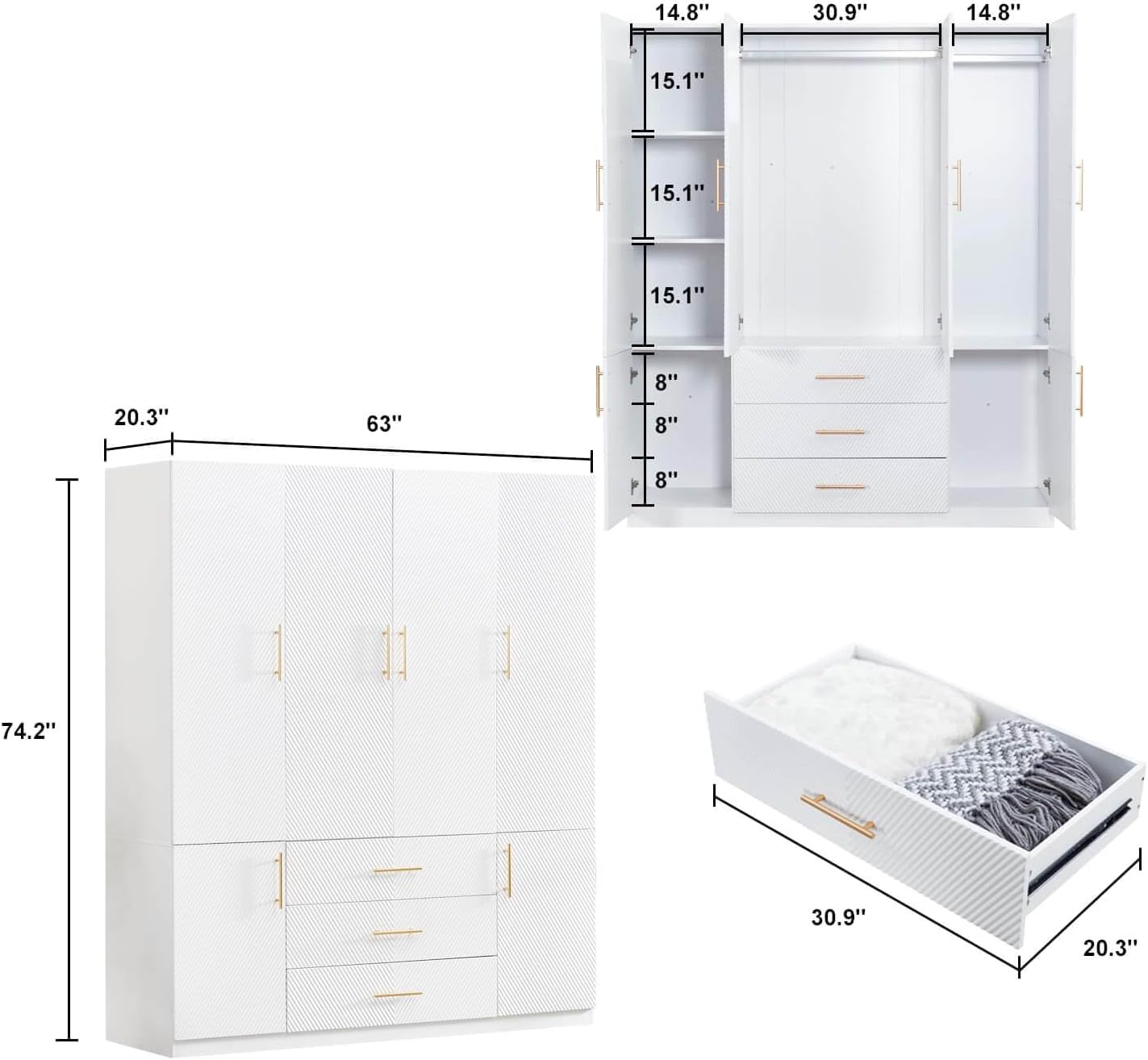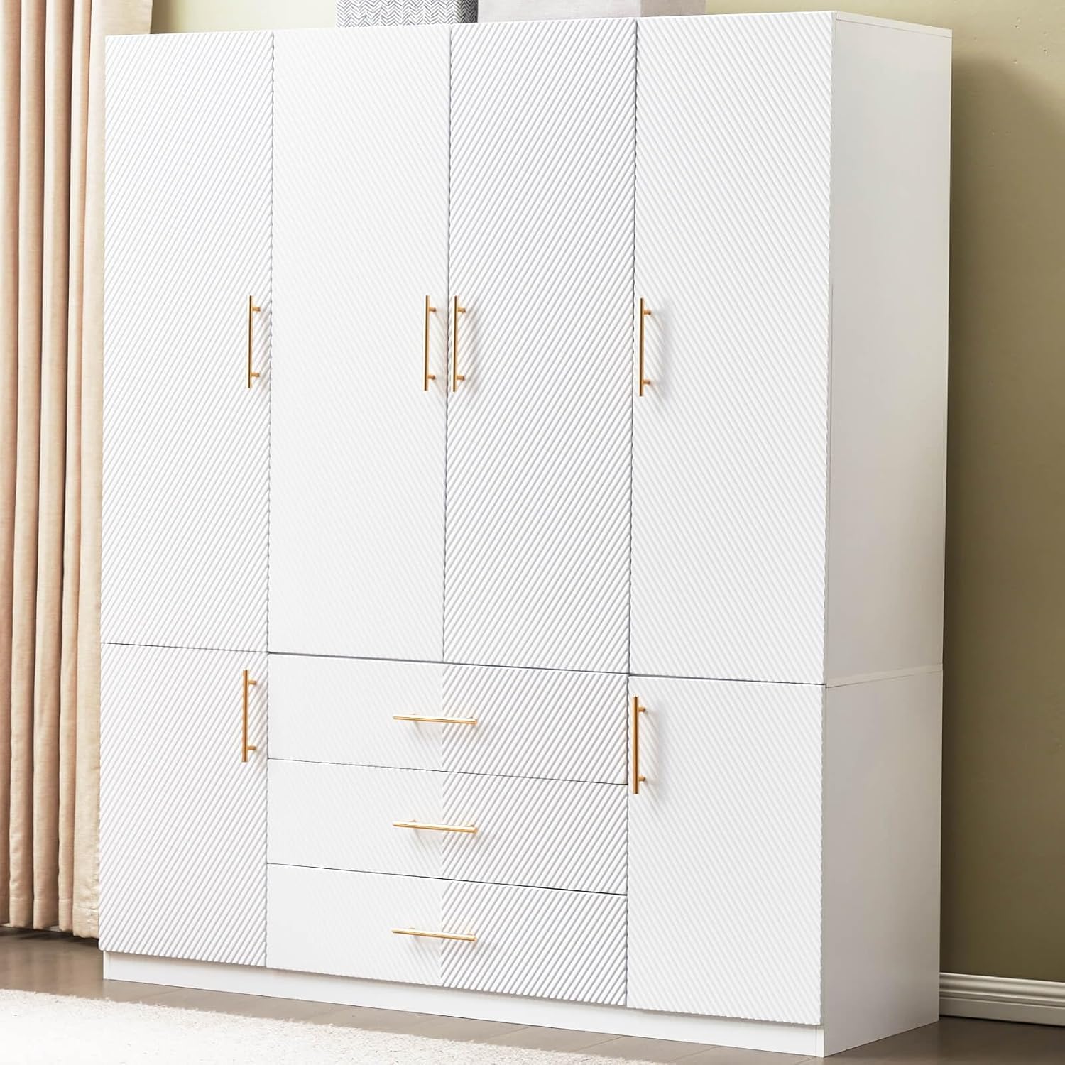 【Ample Storage Space】 Our 4-door armoire wardrobe closet comes with 3 drawers and 2 storage cabinets, providing you with plenty of storage space. This armoires and wardrobes rack cabinet will provide convenient and seamless storage anywhere in your home. Drawers with sliders and handles are smooth to pull out and push in, easy to find your clothes.