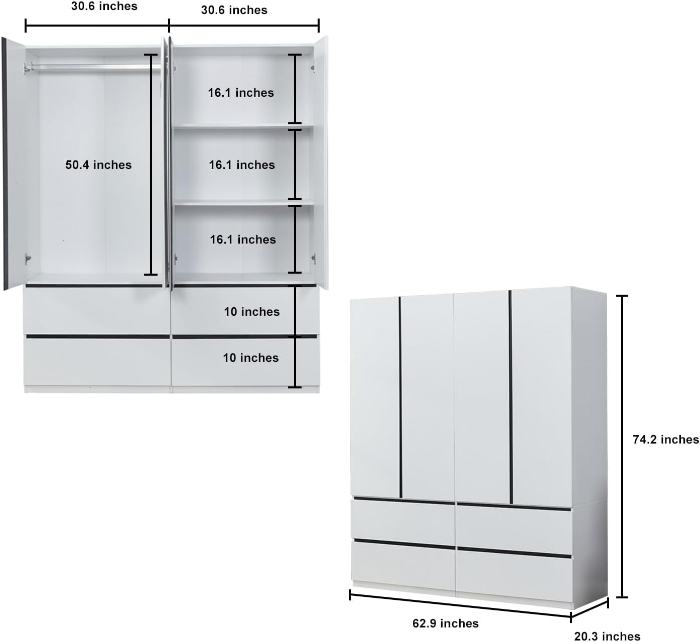 Wooden Armoire Wardrobe Closet, 4 Door 4 Drawers Bedroom Armoires for High Storage Capacity, White Large Storage Cabinet with Hanging Rod and 3 Storage 63″ L x 20.3″ W x 72″ H